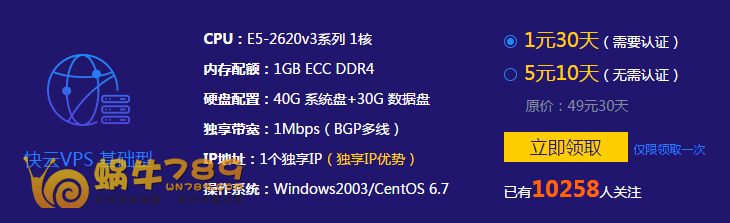 景安网络3月最新活动,新注册用户完成实名认证1元购30天VPS体验,体验机器配置为1核1G内存70G硬盘1Mbps,可选择Windows2003、CentOS 6.7系统。没有注册过景安网络账号的朋友不妨试试。