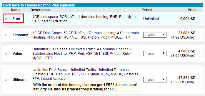 2、我们点击”Order Now”,进入到主机选择页面。请选择”Free”套餐,然后点击“Continue”进入到注册信息填写页面。